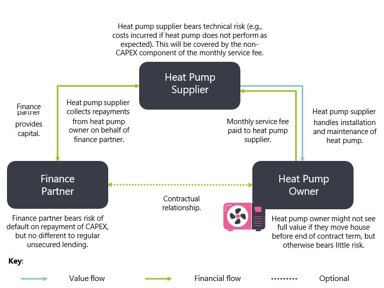 - Risk is borne by finance and heat pump providers rather than the consumer.