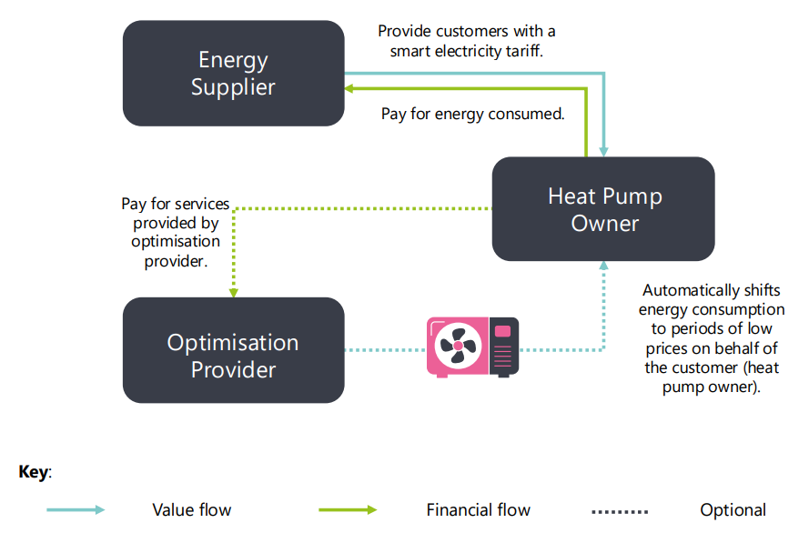 Heat pump owners may use an optimisation provider to control heat pump performance during different price periods on their behalf (at cost).