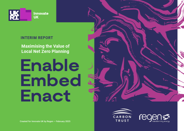 Developed under Innovate UK’s Net Zero Living programme in partnership with Regen and the Carbon Trust, the ‘Enable Embed Enact’ report provides practical guidance for councils to activate local climate plans.
