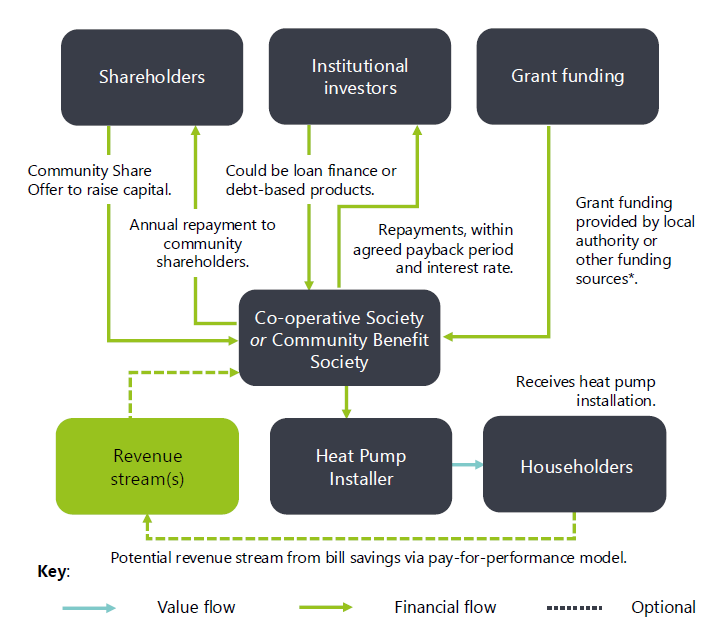 For this model to work, shareholders need a clear route to financial return. RE projects work well because subsequent Power Purchase Agreements (PPAs) guarantee investor payback and can service any loan finance. Applying this model to heat pump installations would require an equivalent revenue stream to cover repayable finance streams – for example, a successor to the domestic Renewable Heat Incentive (RHI) or a revenue-sharing model linked to household energy bill savings.